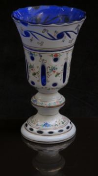 Bohemian overlaid glass vase with hand painted floral decoration, gilt banding and white casing over a blue ground, 27cm tall.