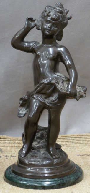 Bronze of a boy holding a basket of fruit, on green marble base, height 39cm together with a gilt metal seated figure on wooden base