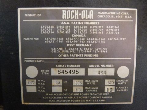 Rock-Ola c1976 integrated circuit, solid state, stereophonic music system 464 juke box, serial no. 645495