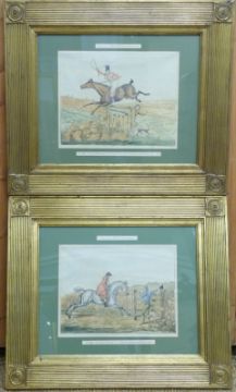 Two 19thC hand tinted 'Meltonian' hunting interest prints in gilt frames, overall size 58 x 68cm
