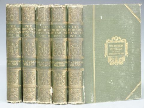 The Modern Physician Being a Complete Guide to The Attainment and Preservation of Health by Dr. Andrew Wilson profusely illustrated by Coloured Plates and Models, Photographs, Diagrams and Woodcuts, Caxton Publishing (c.1910) in 5 volumes, in gilt cloth bindings (5)
