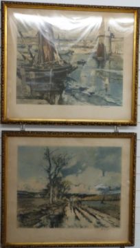 Two Ferdinand Jean Luigini (French, 1873-1943) aquatints, one a ploughing scene, the other a fishing village harbour, dated 1926 and 1927, both signed in pencil bottom right, 47 x 59cm, framed and glazed