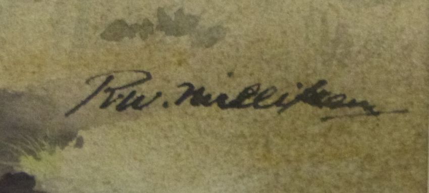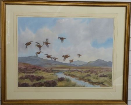 Robert W Milliken (1920-2014) watercolour Scottish or similar landscape with grouse in flight, signed lower right, 52 x 71cm in gilt frame