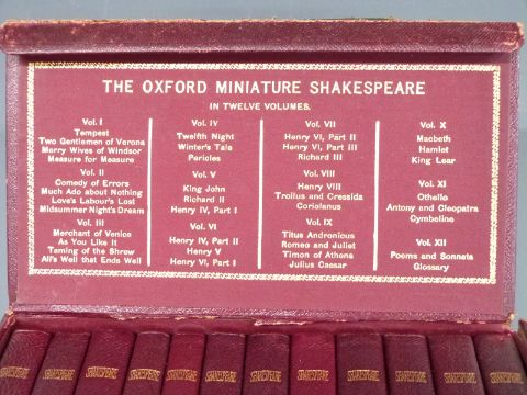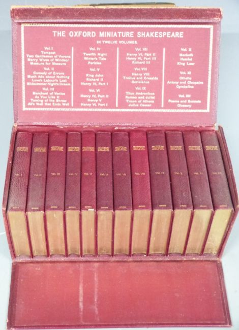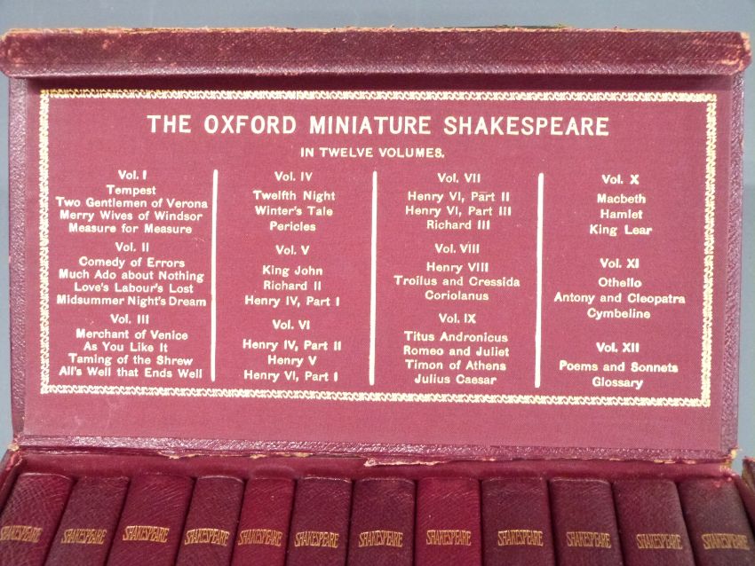 The Oxford Miniature Shakespeare published Henry Frowde 1903 complete in 12 volumes bound in leather with gilt titles, housed in publisher's original cloth box with gilt title and list of contents