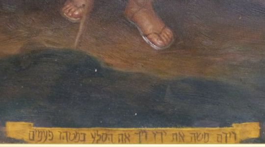 Oil on canvas biblical scene, possibly Moses on the Mount, 79 x 158cm, in textured gilt cushion frame
