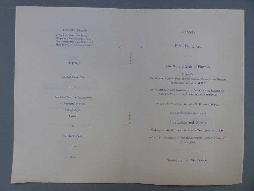 Margret Thatcher signed autographed Rotary Club of Finchley 1976 menu, she was