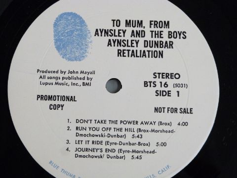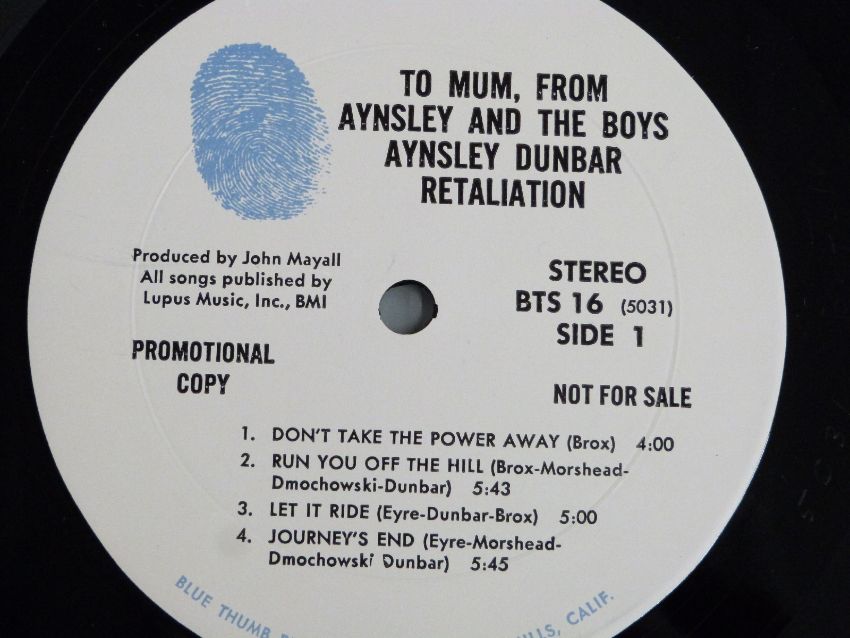 The Aynsley Dunbar Retaliation - To Mum, From Aynsley and The Boys (BTS 16), promo copy, record and punched cover appear Ex
