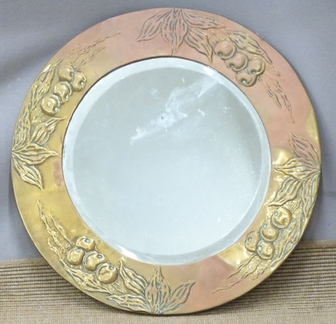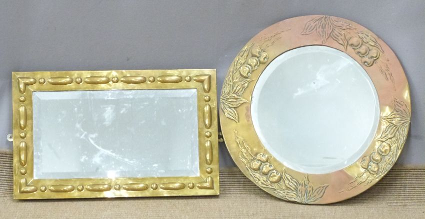 Two Arts and Crafts style bevelled glass mirrors with relief moulded decoration, 51x33cm and diameter 48cm
