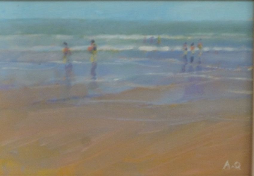 Andrew Quelch (b 1969)  four acrylic coastal landscapes, two depicting St. Ives, Cornwall 25 x 30cm each, one depicting Old Harry Rocks Dorset and one of bathers in the surf, all initialled lower right
