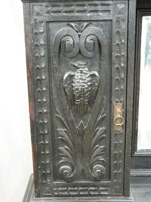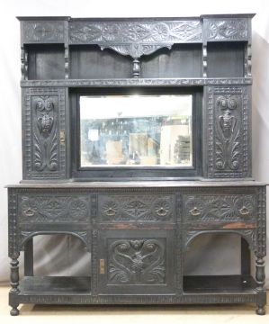 Carved oak dresser, the top being cupboards flanking a bevelled edge mirror, the base with fitted three drawers and single cupboard, W 180cm x D 56cm x H 213cm