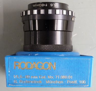 Three photographic enlarging lenses comprising Tominon 1:4.5 f=50mm, Rodenstock 1:5.6 f=80mm and EL-Nikkor 1:2.8 f=50mm