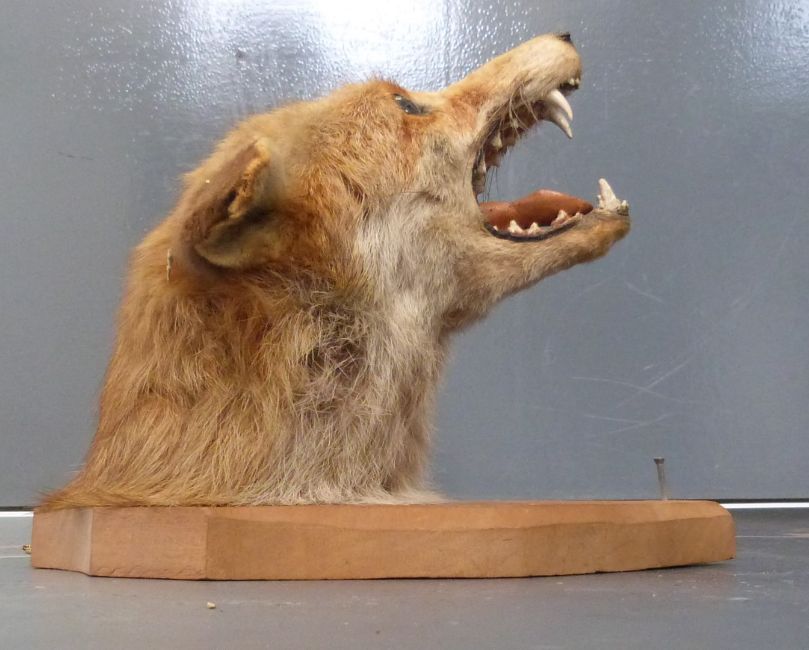 Taxidermy study of a fox mask mounted on a wooden shield, H29cm