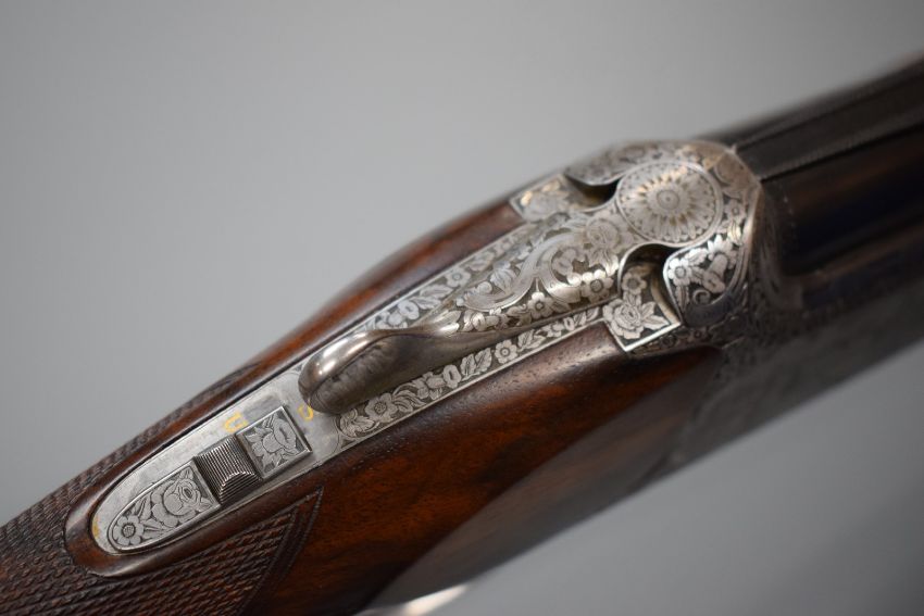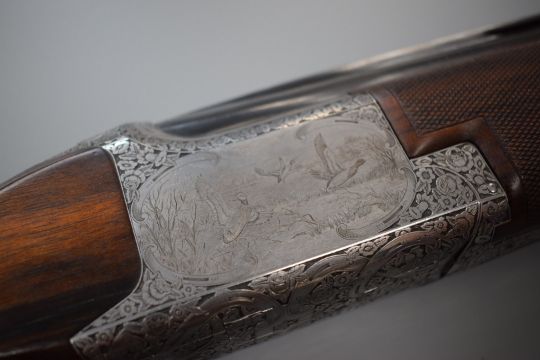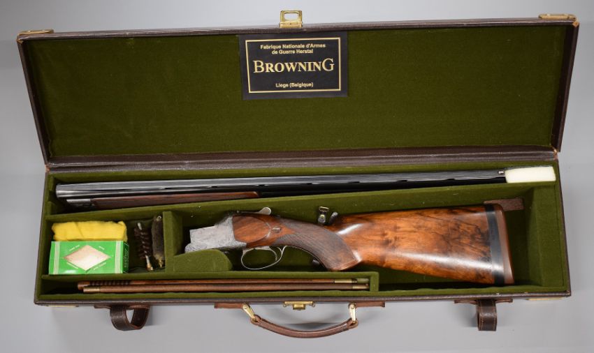 Browning B25 12 bore over and under ejector shotgun custom built and engraved by A M Brown with engraved scenes of dogs to the locks fine floral and scrolling engraving to the underside, trigger guard, top plate, thumb lever and safety, chequered semi-pistol grip and captive forend, carved teardrop to the wrist, single selective trigger, vented top rib and 27.5 inch barrels choked ½ and full, overall length 113cm, length of pull 36cm, serial number 12050 S72, in fitted leather case with Browning label. PLEASE NOTE THAT A VALID RELEVANT FIREARMS/SHOTGUN CERTIFICATE IS REQUIRED TO HANDLE/PURCHASE THIS ITEM.