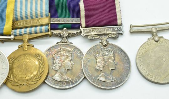 British Army WW2 and later medal group comprising Defence Medal, War Medal and Korea Medal named to 22293142 CFN G Flack REME, United Nations Korea Medal, General Service Medal with clasp for Malaya (Cpl Flack), Long Service and Good Conduct Medal (S/Sgt Flack) and an additional Defence Medal