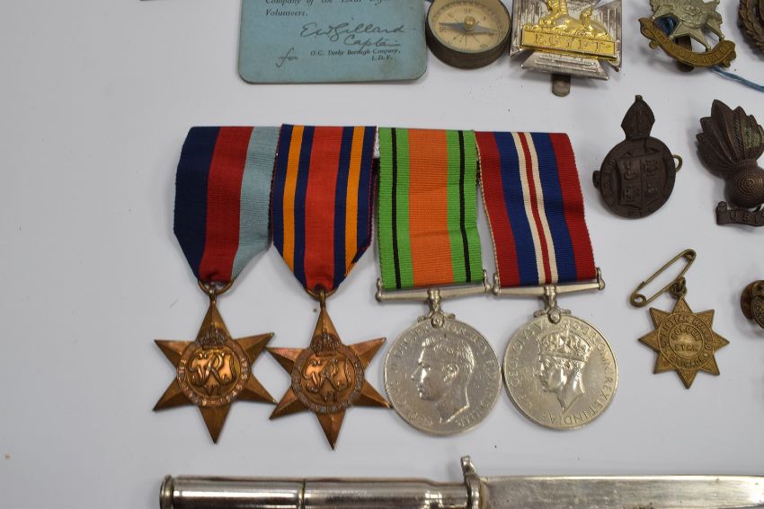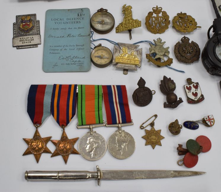 WW2 medals, badges and ephemera, believed to have been awarded to 243607 Lieut. Donald Peter Bennett, found in named trunk and alongside flying trousers which are lot 1157 in this sale. Includes group of four 1939/1945 Star, Burma Star, Defence Medal and War Medal, Derby Borough Local Defence Volunteers card, badges including Notts and Derby, RAF, Royal Engineers, BGSCCF and RPA, Mk III. A compass impressed 1942, canvas pistol holder (1940), interesting chain mail armour, possibly WW1, ARP instructions, RAF SP armbands, ephemera for RAF Takoradi, Gold Coast, Africa including Christmas menus, Accra Brewery, football match, programmes etc