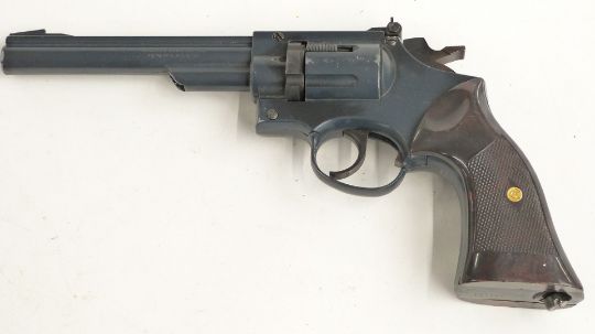 Crosman Model 38T six-shot double action .22 revolver air pistol with chequered grips, serial number 100163, in original fitted box with instructions.
