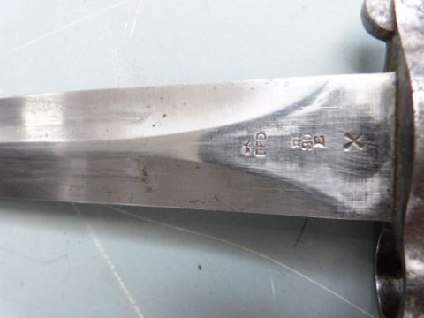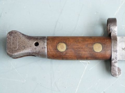 British 1888 pattern Mk 2 bayonet with oil hole in pommel, clear stamps to ricasso, 30cm blade and leather scabbard