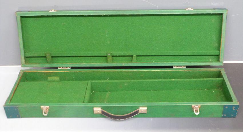 Two shotgun cases one with fitted interior and metal bound corners (82 x 23 x 8.5cm) the other wooden with padded interior 81 x 21 x 11cm.