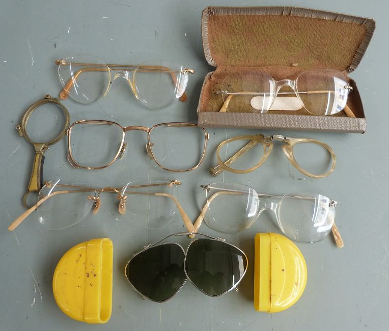 Five pairs of retro and vintage spectacles, three being of frameless design, two pairs of Art Deco style lorgnettes and a pair of clip on sunglasses