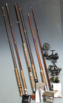Six trout and salmon fly fishing rods including Hardy 8 1/2, Ogden Smith trout, Bruce & Walker 6-8 Silver Stream, salmon rod, Daiwa Graphite CF-98 15ft, 10/11 etc
