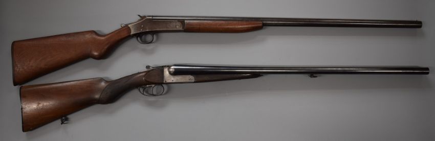 Two 12 bore shotguns one Harrington & Richardson Model 1908 with semi-pistol grip and 30 inch barrel, overall length 116cm, serial number A465214, the other unnamed side by side with chequered semi-pistol grip and forend sling suspension mounts, double trigger and 27.75 inch barrel, overall length 112cm, serial number A11479. PLEASE NOTE THAT A VALID RELEVANT FIREARMS/SHOTGUN CERTIFICATE IS REQUIRED TO HANDLE/PURCHASE THIS ITEM.
