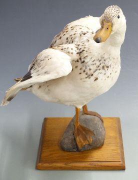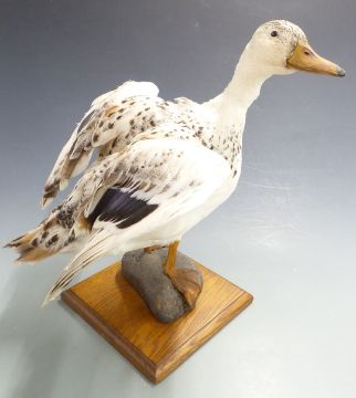 Taxidermy study of a Mallard Call duck raised on faux pebble and oak base, H39cm