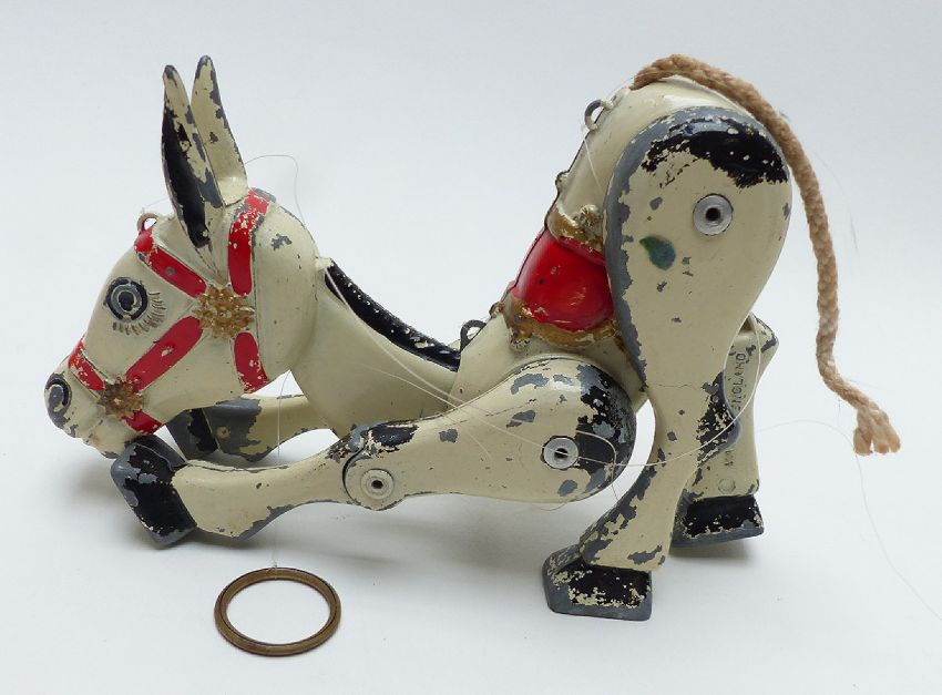 Three dolls and figures comprising Moko diecast Muffin The Mule puppet, bendy Yogi bear and a composite doll with weighted eyes and jointed limbs 43cm tall.