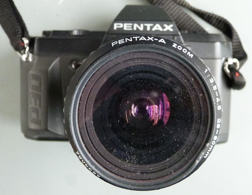 Two SLR cameras comprising Pentax P30N with 1:3.5-4.5 28-80mm lens and Minolta 7000 Maxxum with 50mm 1:1.7 and 70-210 lenses, Pentax Espio 738G and a military telescope marked Mk1 marine
