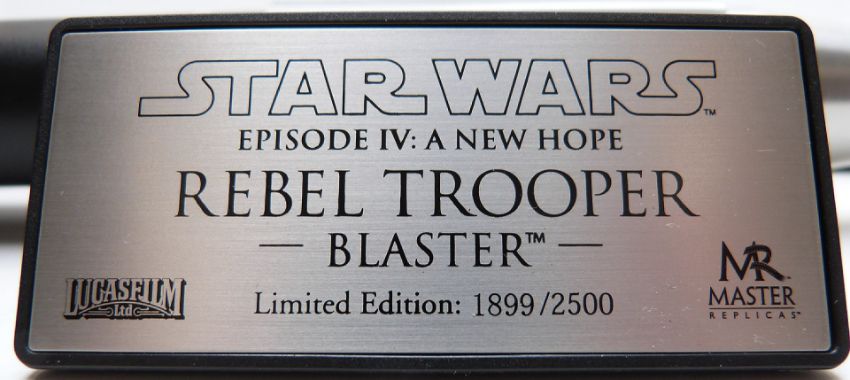 Star Wars Master Replicas Rebel Trooper Blaster from episode IV: A New Hope 1:1 scale limited edition number 420 of 2500 pieces with mirrored display stand, perspex dust cover, presentation plaques, certificate of authenticity, all related paperwork, original box and packaging. Item number SW-125.
