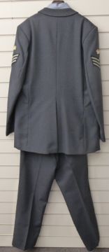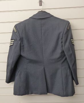 Royal Air Force uniforms comprising two tunics, one with RAF Regiment insignia and sergeant's chevrons, the other with Flight Sergeant's rank to sleeve, two mess vests/waistcoats one with navigator's wing insignia, greatcoat etc