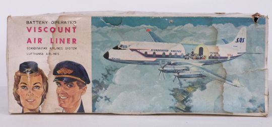 Tomiyama Japan tinplate battery operated Scandinavian Airlines System Lufthansa Airlines Viscount Air Liner, TP-237, in original box.