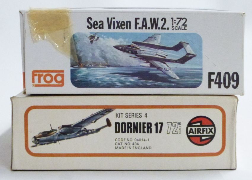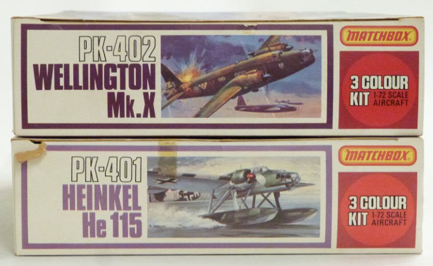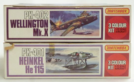 Eight Matchbox, FROG, Heller, Airfix and similar 1:72 scale plastic model kits including Wellington Mk.X PK-402, Heinkel He 115 PK-401, AMD Mirage 2000, Grumman A6A Intruder etc, all in original boxes.