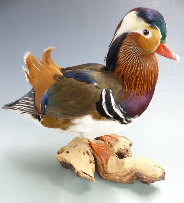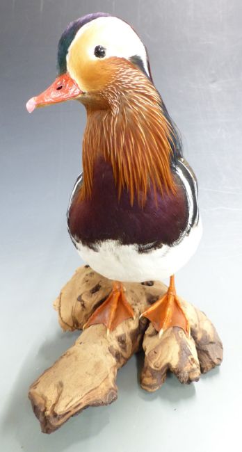 Taxidermy study of  a Mandarin duck mounted on a wooden base, H29cm