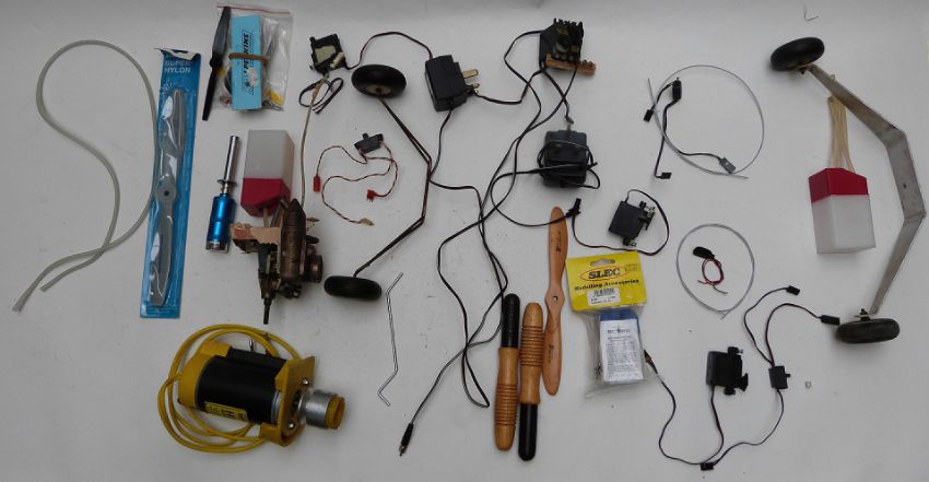 Model remote control aircraft together with a quantity of accessories including OS 20 engine, electric starter motor, fuel tanks, glow plugs, servos etc