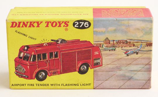 Dinky Toys diecast model Airport Fire Tender with Flashing Light, red body and steel hubs, 276, in original box.