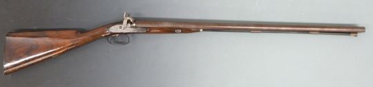 Westley Richards 14 bore side by side muzzle loading hammer action shotgun with named and engraved locks, stylised dolphin hammers, engraved pineapple finialled trigger guard, top plate and mounts, brass tipped wooden ram-rod, vacant cartouche to the underside of the stock and 30 inch silver inlaid Damascus barrels, overall length 117cm.