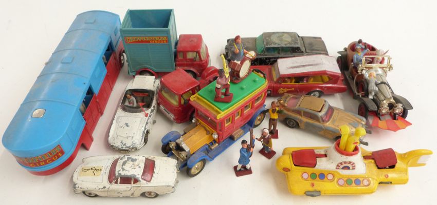 Ten Corgi Toys diecast model vehicles including Chipperfields Circus, Chitty Chitty Bang Bang, The Green Hornet, The Saint's Volvo, James Bond Aston Martin DB5 and Toyota 200 GT, The Beatles Yellow Submarine, The Monkees Monkeemobile etc.