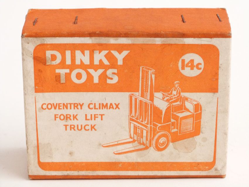 Dinky Toys diecast model Coventry Climax Fork Lift Truck with orange body, black boom and green attachment and hubs, 14c, in original box.