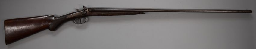 Unnamed .410 side by side hammer action shotgun with engraved locks, trigger guard, top plate and thumb lever, chequered semi-pistol grip, double trigger and 29.5 inch barrels, overall length 115cm, serial number 21407. PLEASE NOTE THAT A VALID RELEVANT FIREARMS/SHOTGUN CERTIFICATE IS REQUIRED TO HANDLE/PURCHASE THIS ITEM.