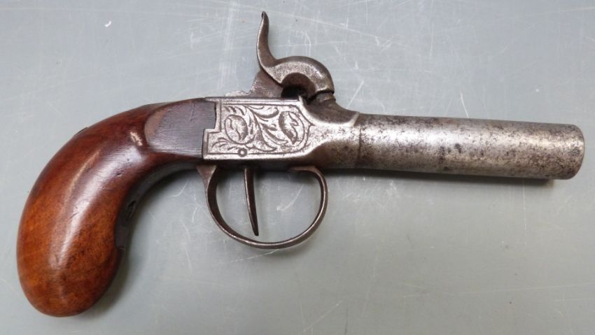 Belgian brass percussion hammer action gun with engraved lock and trigger guard, shaped wooden grips, vacant shield shaped cartouche to the wrist and 2.5 inch turn off barrel, overall length 17cm.