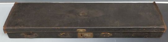 J. B. Warrilow Gun Works of Chippenham fitted leather shotgun case with original paper label and named brass fittings, 83 x 23 x 9cm.