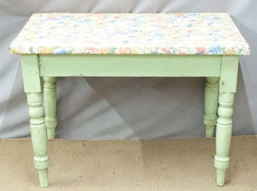 Painted pine table, probably 19thC with floral cover, W106 x D69 x H72cm
