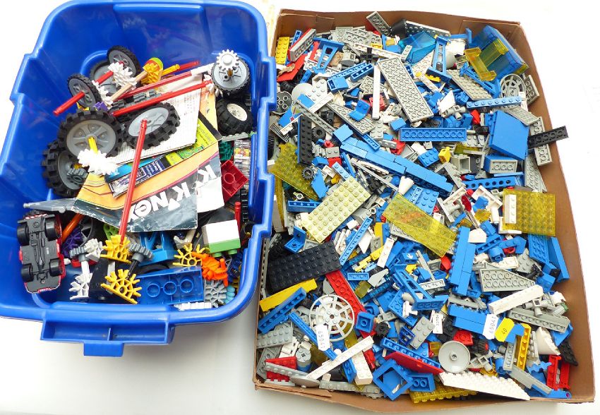 Over 3kg of loose Lego comprising mainly blue and white pieces together with a box of K'nex.
