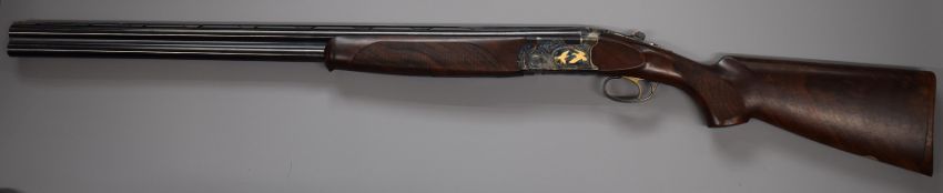 Beretta 687 Silver Pigeon V 12 bore over and under ejector shotgun with all over scrolling engraving, engraved gold birds to the signed lock, gold logo to the underside, gilt single selective trigger, chequered semi-pistol grip and forend, vacant cartouche to the underside of the stock, raised ball sight, vented top rib and 30 inch multi-choke barrels, overall length 120cm, length of pull 36cm, serial number N31517S, in original carry case with three spare chokes and related paperwork. PLEASE NOTE THAT A VALID RELEVANT FIREARMS/SHOTGUN CERTIFICATE IS REQUIRED TO HANDLE/PURCHASE THIS ITEM.
