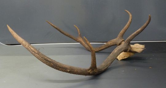 Two deer antler mounts, one dated 1908 shot by Miss E Lambert 13st 8lb, the other probably a Japanese deer, largest W70 x H66cm