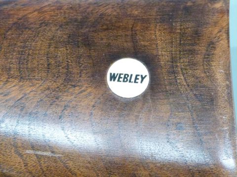 Webley Mark 3 .22 air rifle with semi-pistol grip, named plaque inset to the stock and adjustable sights, serial number A1229.