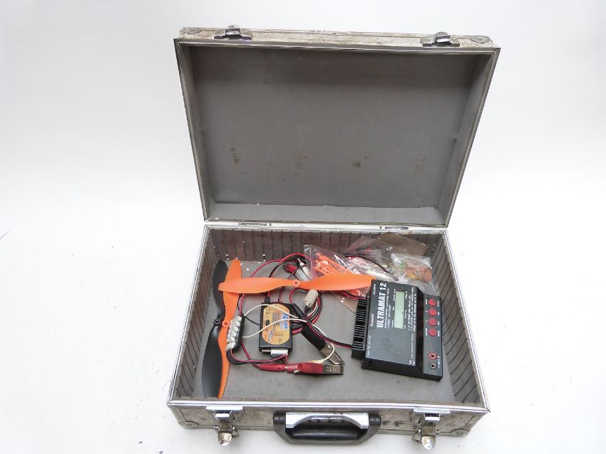 Tamiya radio controlled car together with a large collection of various vintage and modern model aircraft spares, flight case with charger etc