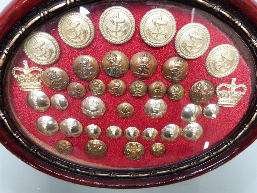 Twenty five regimental lapel/pin badges in glazed display together with a glazed display of military buttons