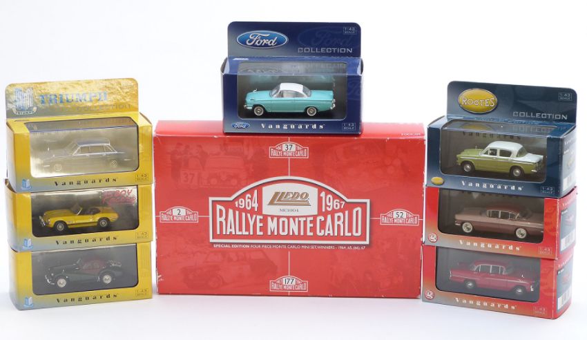 Eight Lledo Vanguards 1:43 scale diecast model vehicles and vehicle sets including Rallye Monte Carlo Special edition four piece Mini set MC1004, Triumph, Ford, Vauxhall and Rootes, most limited edition, all in original boxes.