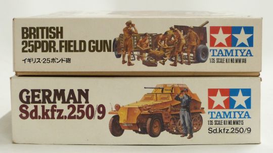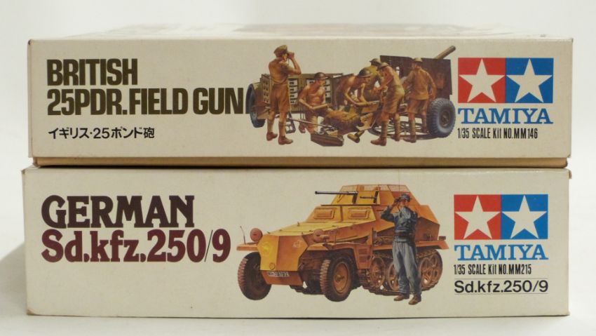 Eighteen Airfix, Tamiya, Italeri, Heller and similar plastic model kits including Universal Carrier Mk.II, British 25Pdr Field Gun, German Sd.kfz.250/9, figures etc, all in original boxes/ packaging.